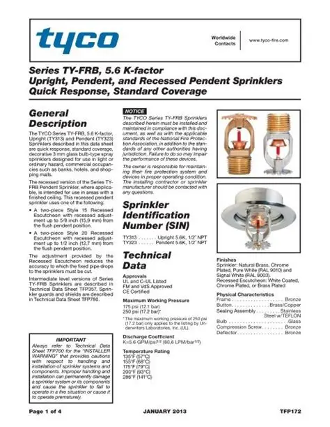 The TYCO Series TY-FRB, 5.6 K-factor, Upright and Pendent Sprinklers described in this data sheet are quick response, standard coverage, decorative 3mm glass bulb-type spray sprinklers designed for use in light or ordinary hazard, commercial occupancies such as banks, hotels and shopping malls.